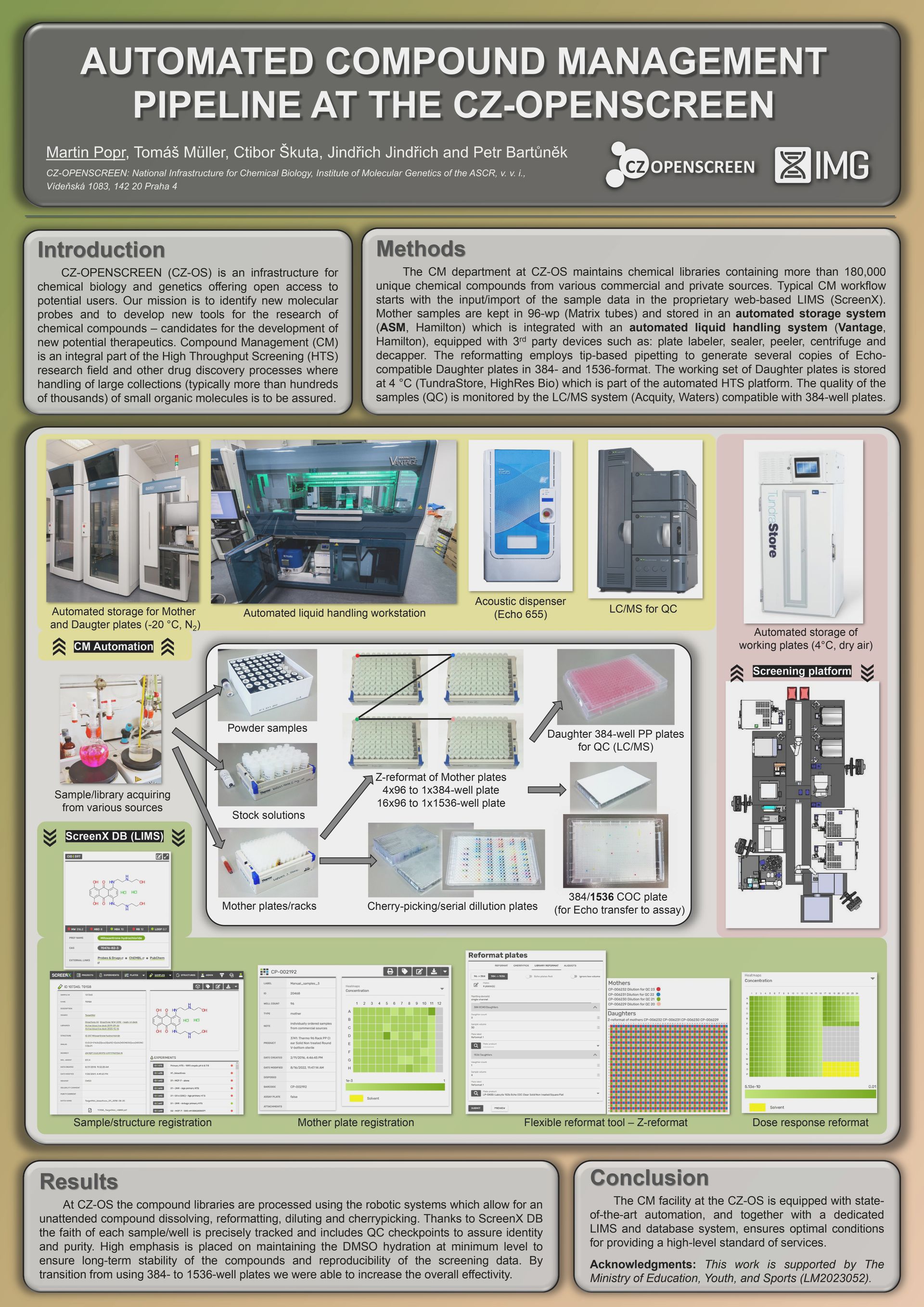 We will present one talk and two posters at the conference. The talk with the title Identification of novel inducers of erythropoiesis by high-content screening will be presented by Petr Bartůněk, the director of CZ-OS, on Thursday afternoon, as a part of the Innovative tools and methods for advanced cell profiling section. Concerning the posters, the first one was created by Martin Popr, the head of the compound management and automation at CZ-OS, and describes our AUTOMATED COMPOUND MANAGEMENT PIPELINE AT THE CZ-OPENSCREEN; the second one, by Ctibor Škuta, the head of the cheminformatics and software development, presents the European Chemical Biology Database (ECBD, ecbd.eu), developed and managed by CZ-OS, and its state in 2023.
