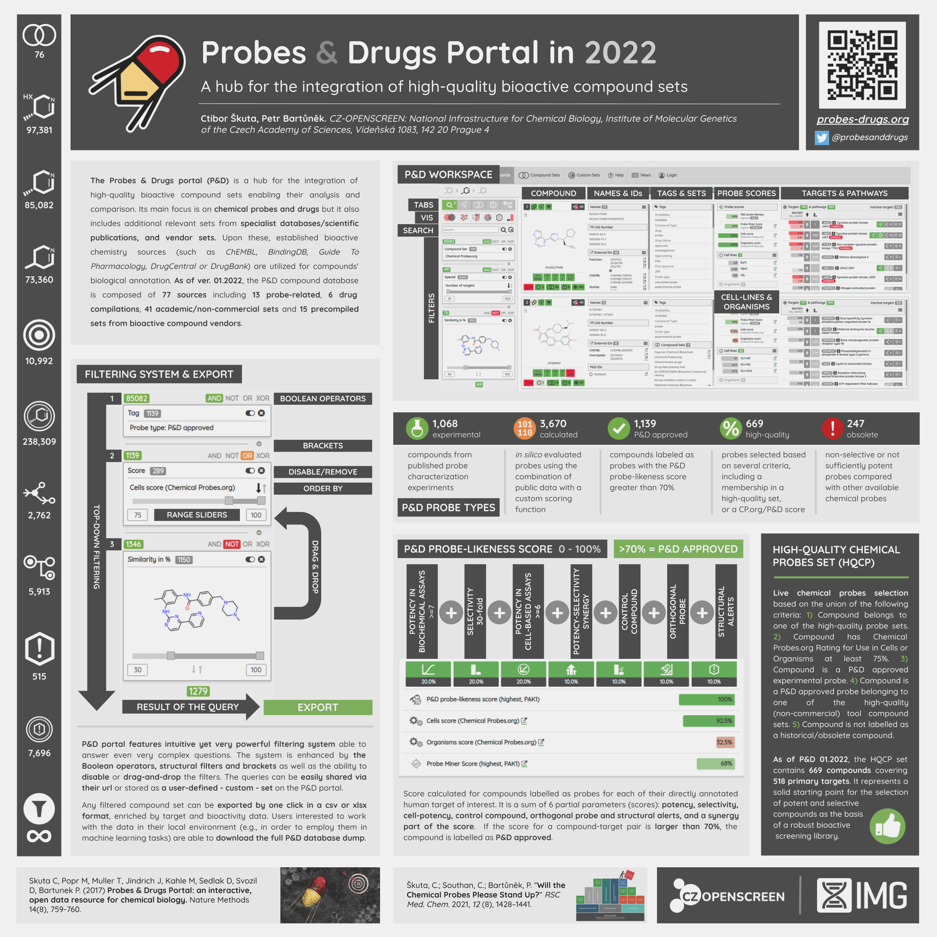 Probes & Drugs (P&D) portal (probes-drugs.org) was released in 2017 to address the problems in the field of chemical probes and other high-quality chemical tools, concerning mainly the fragmentation and obsoleteness of the available data. Since then, it has become one of the major and most comprehensive resources in the field that serves as a hub for the integration of high-quality bioactive compound sets. Apart from the data integration, P&D recently established its own approach to evaluating the probe-likeness of compounds labelled as chemical probes (so-called probe-likeness score) and a live set of high-quality chemical probes (utilizing the score in combination with other key criteria), updated with each new version of P&D. As of ver. 04.2021, this set contains 620 compounds covering 496 primary targets. The synergy between integrated data sources and tools available for their analysis makes P&D a unique discovery platform designated not only for experts in the field of chemical biology but for a wider scientific community with limited knowledge in this area.