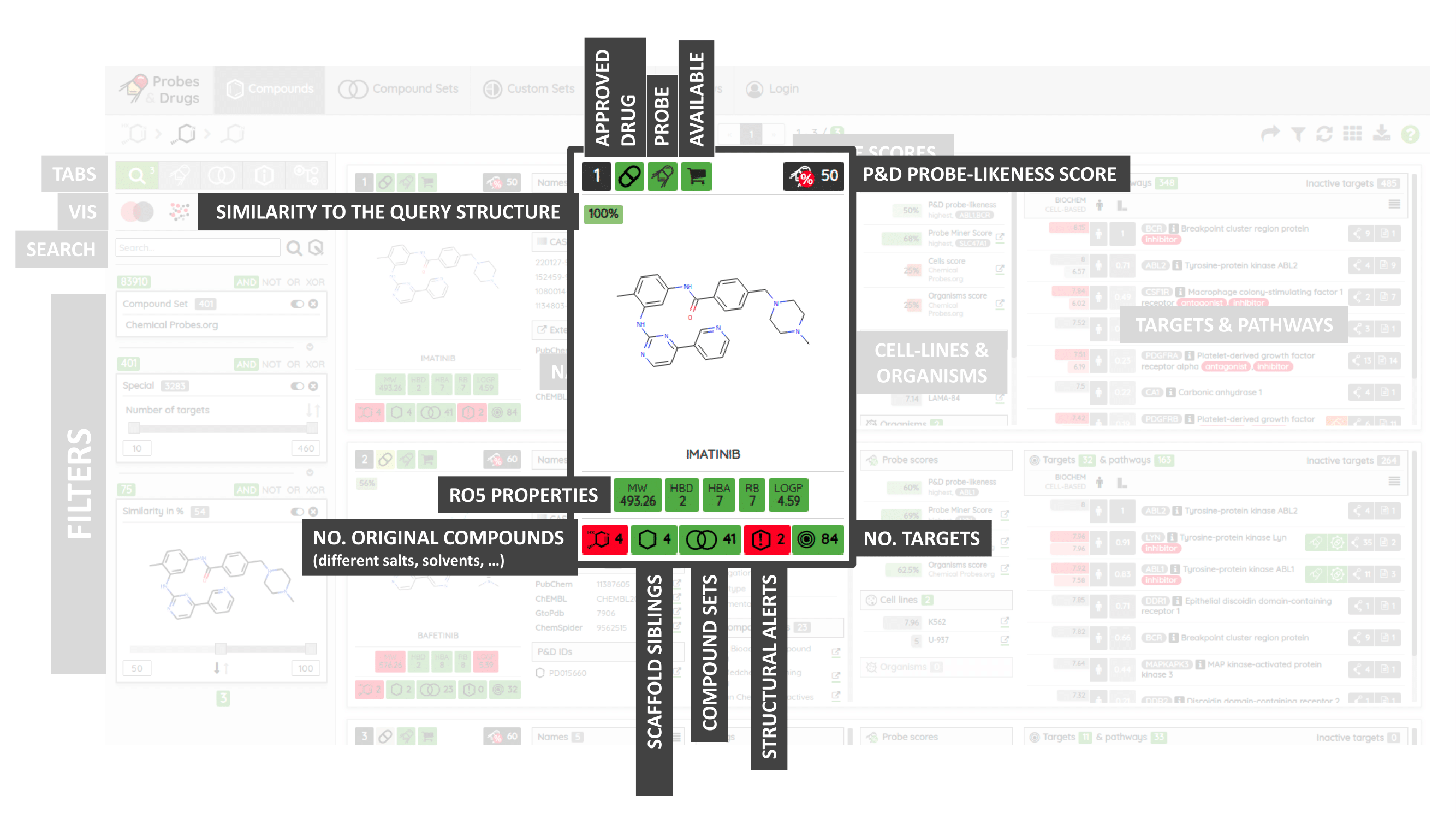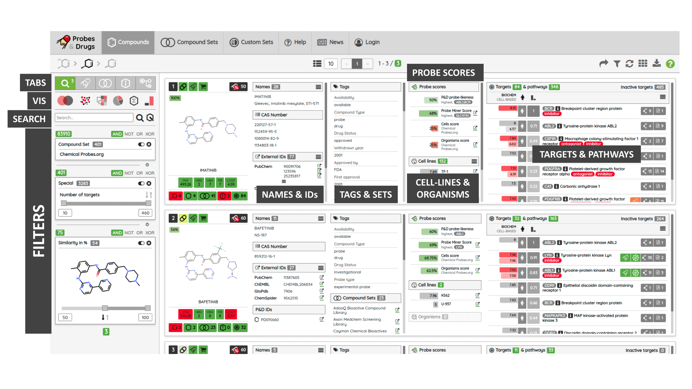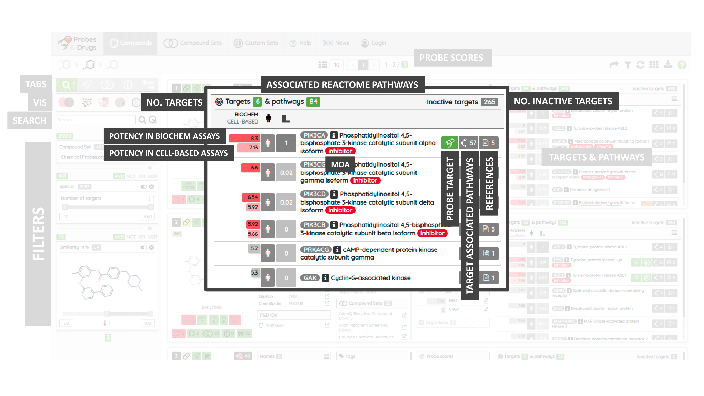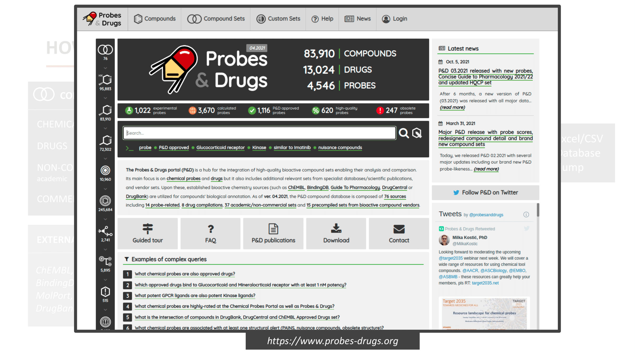 The Probes & Drugs portal (P&D) is a hub for the integration of high-quality bioactive compound sets enabling their analysis and comparison. Its main focus is on chemical probes and drugs but it also includes additional relevant sets from specialist databases/scientific publications, and vendor sets. Upon these, established bioactive chemistry sources (such as ChEMBL, BindingDB, Guide To Pharmacology, DrugCentral or DrugBank) are utilized for compounds' biological annotation. As of ver. 04.2021, the P&D compound database is composed of 76 sources including 14 probe-related, 8 drug compilations, 37 academic/non-commercial sets and 15 precompiled sets from bioactive compound vendors.