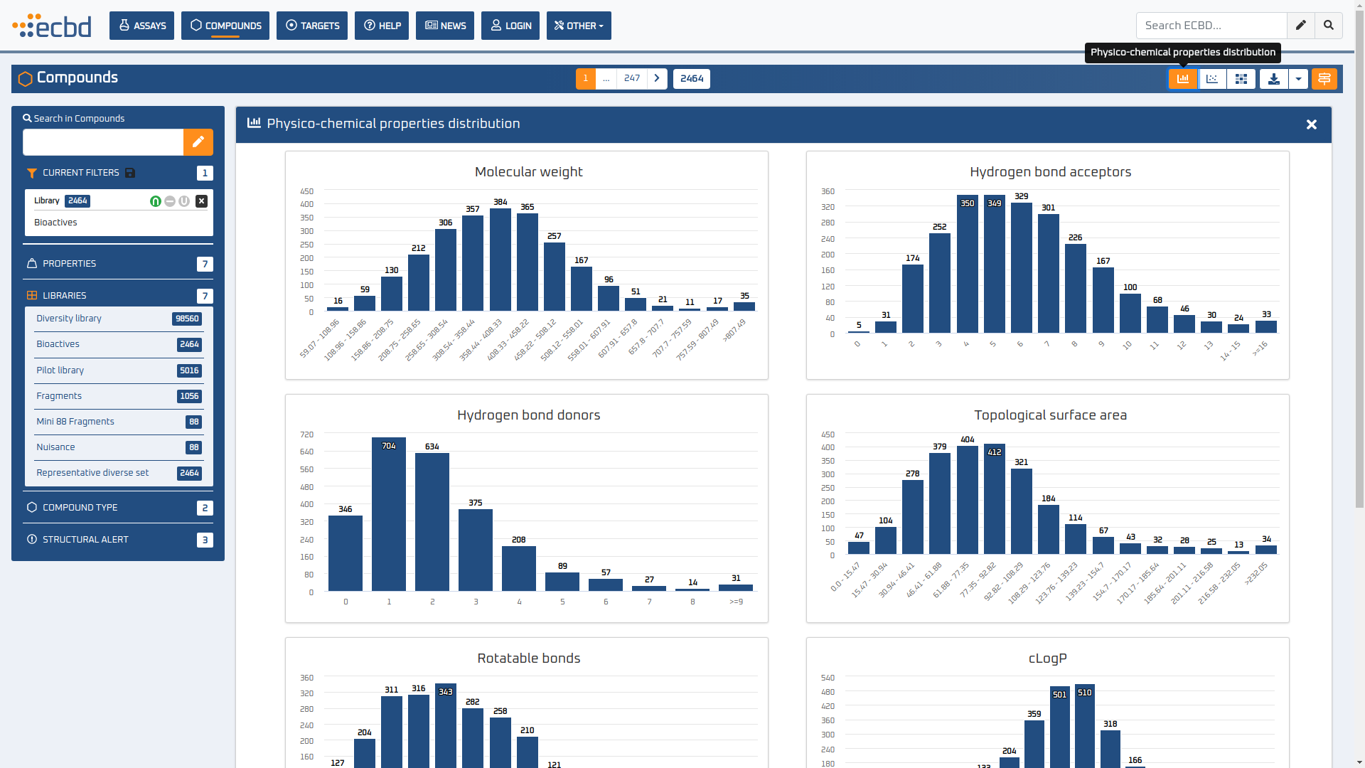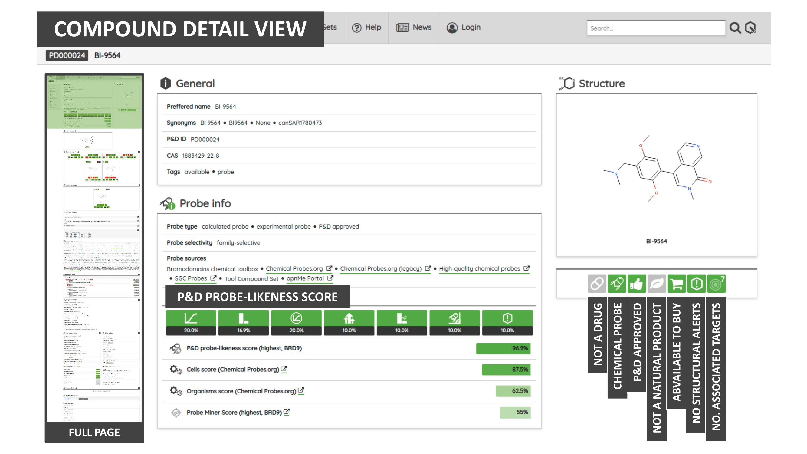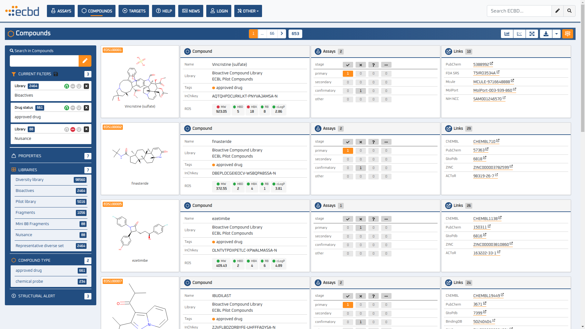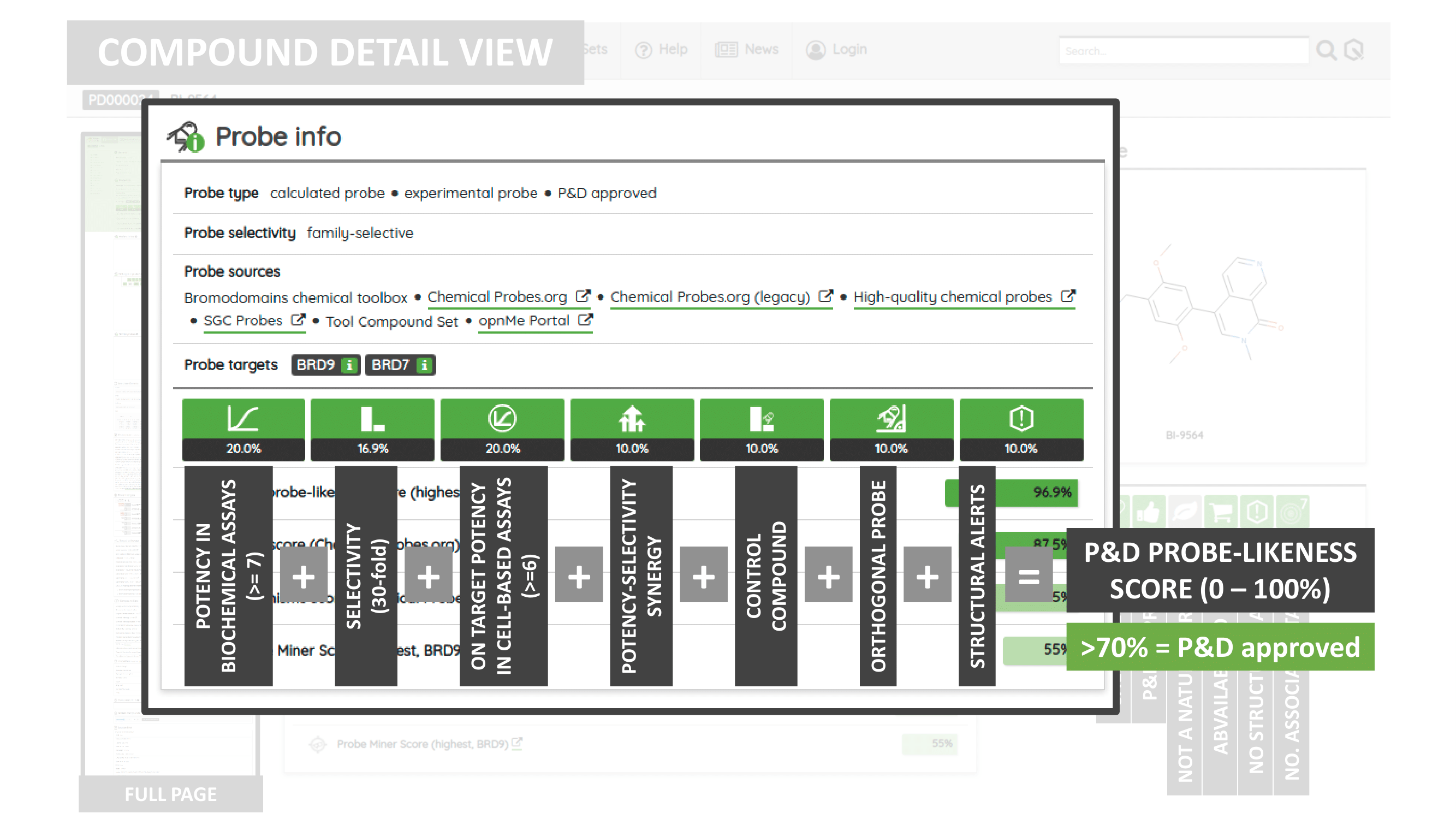 The Probes & Drugs portal (P&D) is a hub for the integration of high-quality bioactive compound sets enabling their analysis and comparison. Its main focus is on chemical probes and drugs but it also includes additional relevant sets from specialist databases/scientific publications, and vendor sets. Upon these, established bioactive chemistry sources (such as ChEMBL, BindingDB, Guide To Pharmacology, DrugCentral or DrugBank) are utilized for compounds' biological annotation. As of ver. 04.2021, the P&D compound database is composed of 76 sources including 14 probe-related, 8 drug compilations, 37 academic/non-commercial sets and 15 precompiled sets from bioactive compound vendors.
