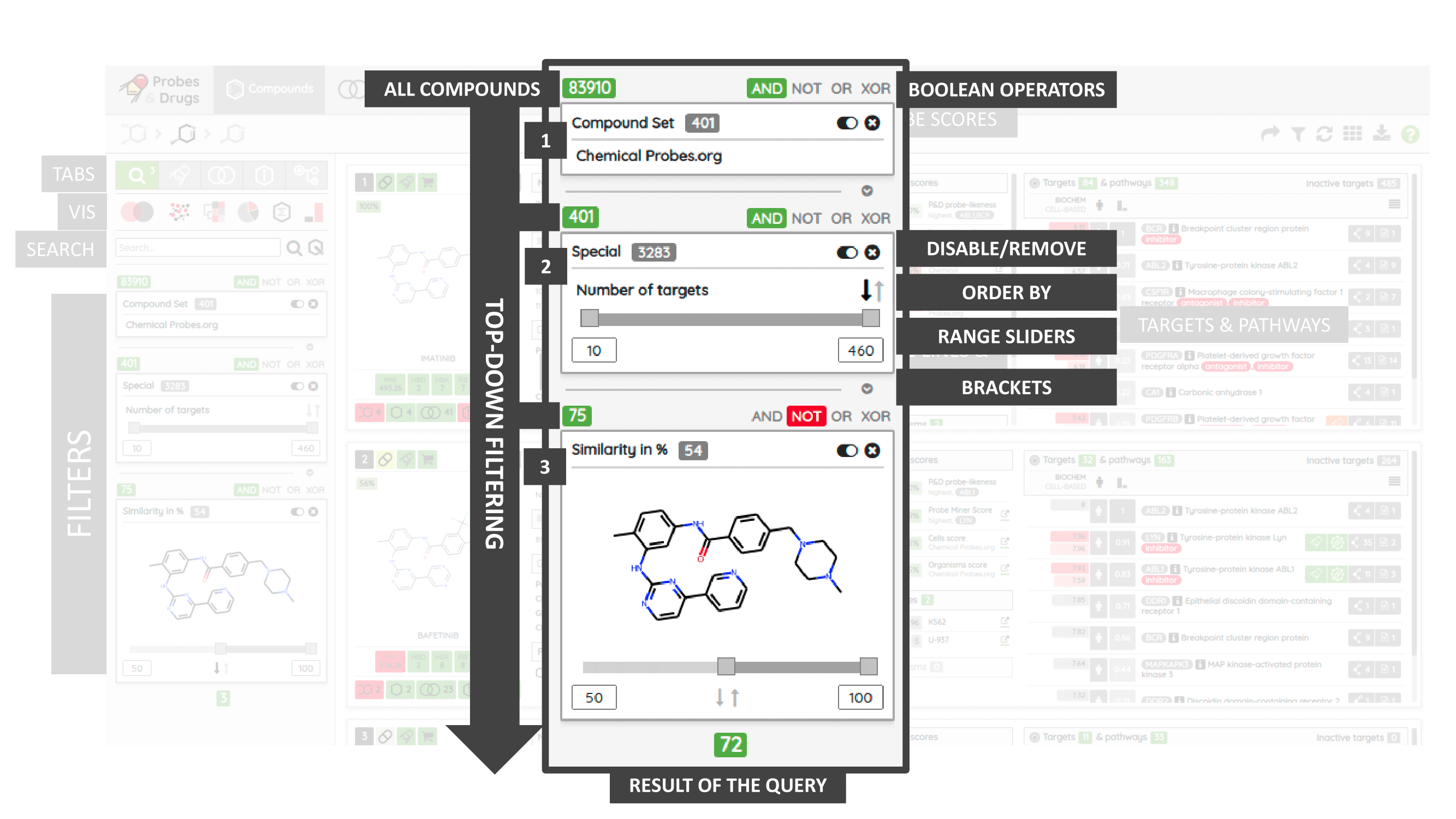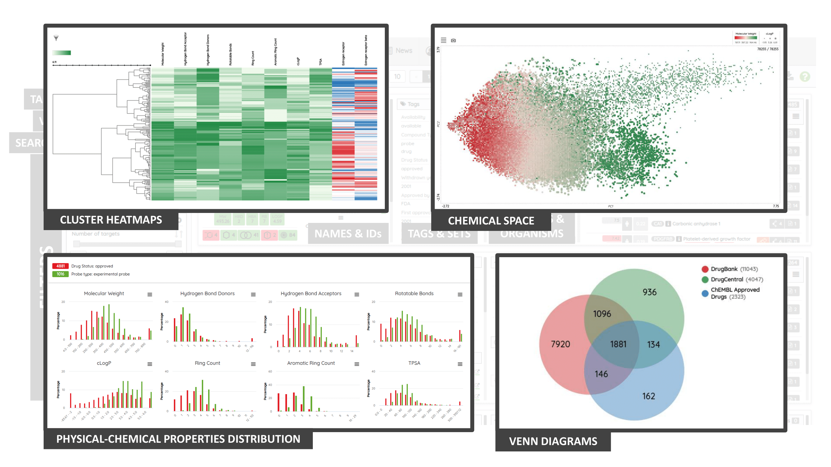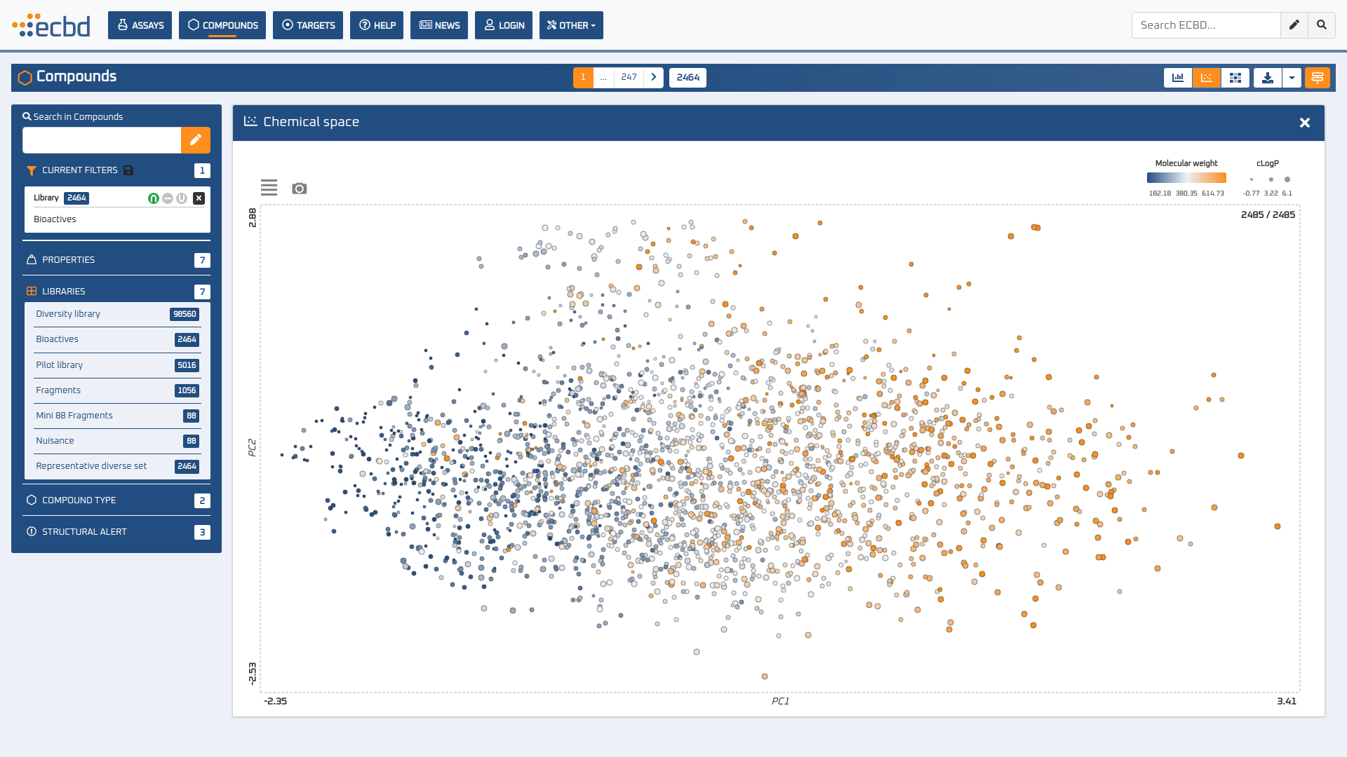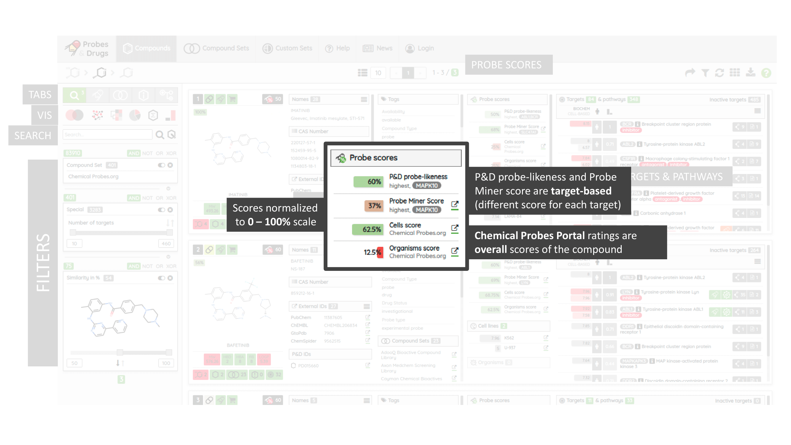 The Probes & Drugs portal (P&D) is a hub for the integration of high-quality bioactive compound sets enabling their analysis and comparison. Its main focus is on chemical probes and drugs but it also includes additional relevant sets from specialist databases/scientific publications, and vendor sets. Upon these, established bioactive chemistry sources (such as ChEMBL, BindingDB, Guide To Pharmacology, DrugCentral or DrugBank) are utilized for compounds' biological annotation. As of ver. 04.2021, the P&D compound database is composed of 76 sources including 14 probe-related, 8 drug compilations, 37 academic/non-commercial sets and 15 precompiled sets from bioactive compound vendors.